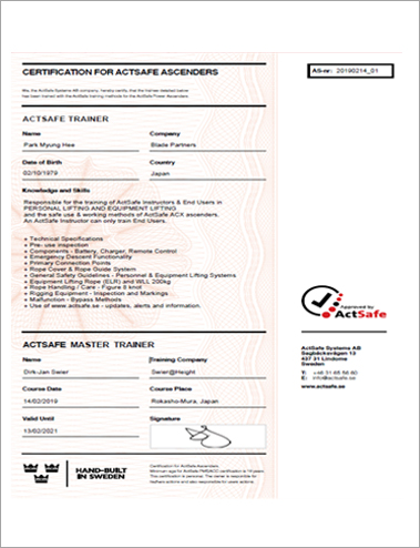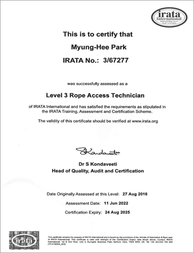 - 일본에서 수년간의 실 현업을 바탕으로 다양한 Blade Damage에 대한 유지 보수 업무와 기술력 보유 - 국제산업로프 IRATA의 10년경력으로서,각 현장에 대한 고소작업의 전문화 보유- IRATA TA(Technical Authority)로서, 현장별 상황에 특화된 안전기준과 위험성 평가를 통한 레스큐 대응력 보유